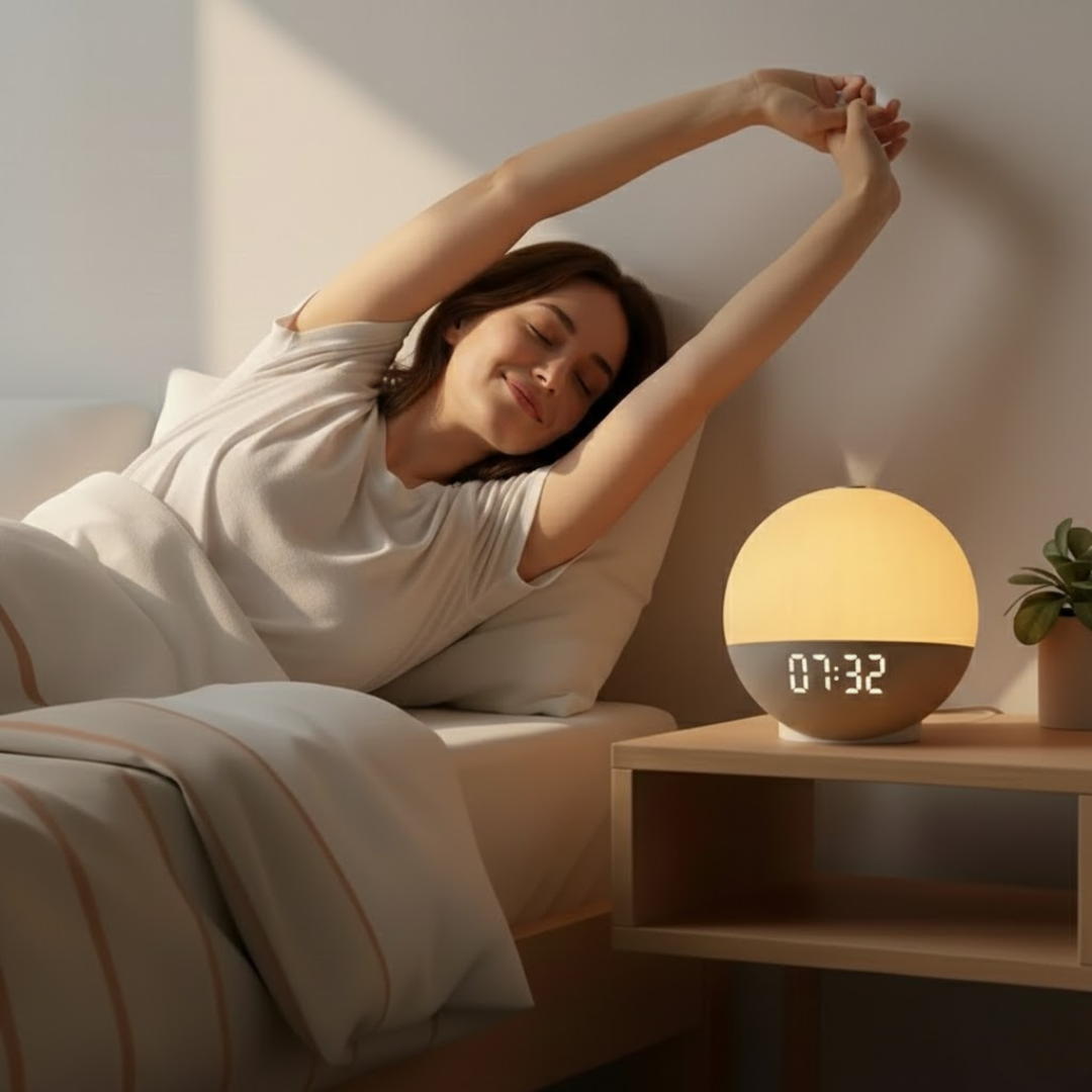 The light begins to brighten softly before your alarm goes off, signaling your body to wake up refreshed and full of energy.
